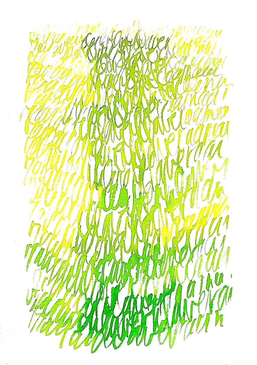 (Aan)tekeningen worden woordlandschappen (Schrifturen) op (geschept) papier, briefkaarten (Mail art), ramen (Urban art) en weefsels (Textile Art).